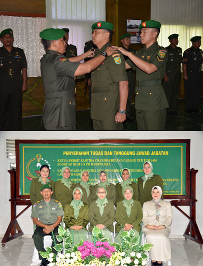Oleh karena itu Danrem 044/Gapo mengajak seluruh Perwira dan Ibu-ibu bahwa dalam organisasi militer dan organisasi Persit sudah ada aturan tugas dan tanggung jawab Jobdicriptions sudah jelas, dimana sudah jelas tugas dan tanggung jawab baik yang tertulis maupun yang tidak tertulis baik itu merupakan tugas pokok ataupun diluar tugas pokok walaupun kadang-kadang kita melaksanakan tugas diluar tugas pokok kita, hal tersebut merupakan konsekwensi tugas dan jabatan yang diemban kepada kita. Sebagai wakil ada, sebagai staf ada, jadi di organisasi militer itu tugas dan tanggung jawab yang kita lakukan sangat mudah karena sudah arah dan ketentuan yang akan dilakukan, yang paling penting apapun yang dilakukan dilapangan agar dilaporkan untuk ditindaklanjuti ke Komando Atas. Begitu juga dalam kegiatan organisasi Persit yang paling dominan adalah kegiatan kekeluargaan, kegiatan yang saling tolong menolong, kegiatan yang penuh dengan toleransi, kegiatan yang penuh dengan pengertian tidak seperti di militer, karena kalau pimpinan memberikan tindakan kepada anggotanya itu berarti tidak karena benci, bukan karena tidak suka, yang tidak disukai karena kelakuannya, tidak suka karena yang dilakukan itu salah dengan memberikan tindakan yang keras dalam rangka mengarahkan ke yang lebih baik makanya apapun tugas dan tanggungjawab yang diberikan kepada kita harus kita cintai, kita sambut semua tugas yang dibebankan kepada kita, semakin banyak tantangan semakin kita mempunyai peluang, semakin adrenalin terpacu, kita biasa-biasa saja tidak ada yang dikerjakan membuat kita malas, tetapi semakin banyak permasalahan-permasalahan dilapangan maka kita mempunyai pemikiran untuk menyelesaikan. Jangan coba-coba kita menghindari permasalahan yang ada karena tugas dan permasalahan harus kita hadapi dan selesaikan, jangan kita dikejar-kejar oleh masalah kalau kita hadapi masalah maka hadapi sampai selesai, jadi masalah yang takut pada kita bukan kita yang takut pada masalah. Setiap manusia punya keinginan dan rencana tapi yang harus kita sadari bahwa Tuhan Yang Maha Esa Allah SWT punya niat dan rencana yang lebih baik, untuk itu syukuri dan nikmati rahasia-rahasia Allah itu. Selanjutnya diadakan serah terima Ketua Persit Kartika Chandra Kirana Cabang XVII Dim 0406 Koorcab Rem 044 PD II/Sriwijaya kepada Ketua Persit Kartika Chandra Kirana Koorcab Rem 044 PD II/Sriwijaya di kantor Persit Kartika Chandra Kirana Koorcab Rem 044 PD II/Sriwijaya. Hadir pada upacara tersebut Kasrem 044/Gapo, Para Danden Korem 044/Gapo, Para Kasi Korem 044/Gapo, Para Kabalak Korem 044/Gapo, Ketua Persit Kartika Chandra Kirana Koorcab Korem 044/Gapo beserta pengurus.