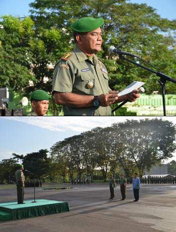 Lampung, (Penrem 043/Gatam) Komandan Korem 043/Gatam, Kolonel Inf Irwan S Marpaung selaku IRUP pada Upacara Bendera Bulanan yang dilaksanakan pada hari Kamis, tanggal 17 April 2014, pukul 07.00 WIB bertempat di Lapangan Saburai Bandar Lampung.
