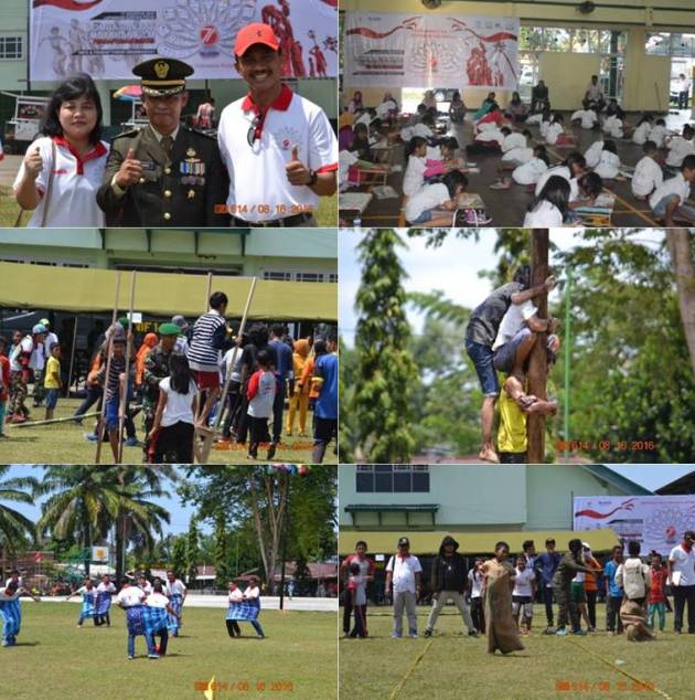 Jambi, (Penrem 042/Gapu) Untuk memeriahkan HUT Kemerdekaan RI Ke 71, Korem 042/Gapu berkerja sama dengan BUMN melaksanakan berbagai perlombaan antara lain panjat pinang, balap karung, sepak bola dalam sarung, tarik bambu, Acara berlangsung dengan penuh meriah dan gembira untuk menyambut HUT RI Ke 71, perlombaan yang dilaksanakan secara terpusat dilapangan upacara Makorem 042/Gapu pada hari Rabu (17/8 ).