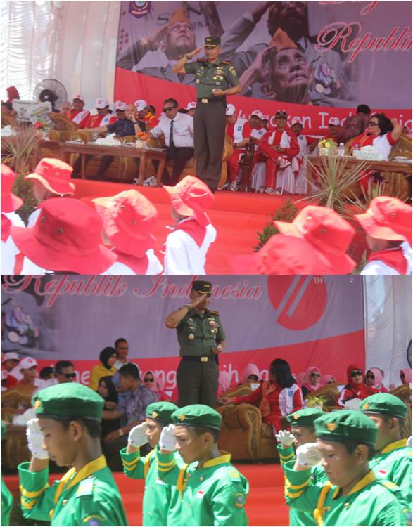 Pangkalpinang(Penrem 045/Gaya) Danrem 045/Garuda Jaya Kolonel Inf Tjaturputra Gunadi Genah. Menerima penghormatan siswa yang mengikuti gerak jalan di Kota Pangkalpinang.(Kamis 18/8)