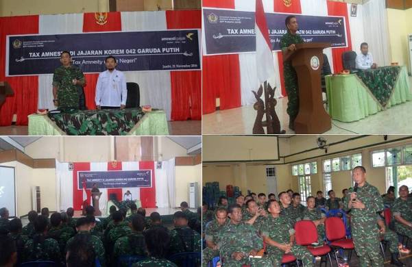 Jambi (Penrem 042/Gapu) Danrem 042/Gapu Kolonel Inf Refrizal mendampingi Kakanpel Pajak Pratama Jambi Bapak Eko Budi Hartono beserta rombongan, yang di ikuti seluruh prajurit dan ASN Korem 042/Gapu dan Satbalak jajaran korem, dalam rangkah melaksanakan sosialisasi Tax Amnesty yang bertempat di Balai Prajurit Korem 042/Gapu, Senin 21/11/2016.