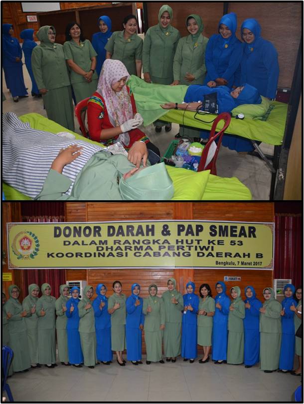 Ketua Persit Kartika Chandra Kirana Koorcab Rem 041 Pd II/Swj Ny. Andi Muhammad mengatakan kegiatan Donor Darah ini, merupakan salah satu wujud kepedulian ibu –ibu Persit Kartika Chandra Kirana Koorcab Rem 041 PD II/Swj dalam mencermati berbagai permasalahan yang dihadapi masyarakat, Khususnya masalah peningkatan derajat kesehatan masyarakat. Kita pahami bersama, bahwa sekarang ini kebutuhan masyarakat terhadap darah semakin meningkat. Permasalahan ini harus kita sikapi bersama sebagai upaya untuk menolong sesama kita yang sedang mengalami kesulitan. Terbatasnya persediaan darah yang dimiliki oleh Palang Merah Indonesia Bengkulu saat ini, menuntut kita semua untuk lebih memasyarakatkan kegiatan Donor Darah seperti ini dengan harapan bahwa setetes darah yang diberikan dapat menyelamatkan jiwa manusia yang sangat membutuhkannya. untuk menambah jumlah donatur darah, pemerintah telah menganjurkan agar dalam setiap hari-hari penting seperti peringatan Hari Ulang Tahun, Hari-hari Besar Nasional atau keagamaan, perlu diisi dengan kegiatan sosial berupa kegiatan Donor Darah”. Ujar Ketua Persit KCK Koorcab Rem 041 PD/Swj. Sehubungan dengan hal tersebut, Ibu-ibu Persit Rem 041, Jalasenastri merasa terpanggil dan merasa ikut bertanggung jawab terhadap masalah-masalah sosial, terutama dalam membantu meringankan kesulitan yang dihadapi masyarakat terkait dengan terbatasnya jumlah darah yang diperlukan. Pelaksanaan kegiatan Donor Darah dalam rangka memperingati HUTPersit ke-71 dan HUT ke – 53 Dharma Pertiwi “ saya harapkan dapat menggugah hati masyarakat pada umumnya dan keluarga TNI pada khususnya, untuk senantiasa peka terhadap berbagai masalah Sosial Kemasyarakatan selain donor darah kita melaksanakan juga Pap Smear bagi ibu-ibu Persit, Dharma Pertiwi dan Jalasenastri yang bertujuan untuk mengantisipasi terhadap baerbagai penyakit yang mungkin timbul di organ tubuh ibu-ibu”. Pungkasnya. Donor darah ini diikuti sekitar 125 orang dan yang bisa diambil darahnya berjumlah 40 orang yang langsung diserahkan ke PMI Bengkulu dan Papsmear.