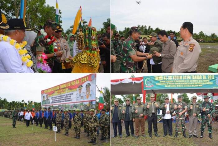 Upacara pembukaan TMMD ini dibuka langsung oleh Bupati Kabupaten Tanjung Jabung Barat Dr.Ir. H. Safrial MS dalam sambutannya menyampaikan atas nama pemerintah dan masyarakat menyampaikan aspirasi kepada TNI Kodim 0419/Tanjab dan masyarakat Tiga Desa di Kecematan seberang Kota yang menyambut baik Program TMMD Ke 98. Bahwa TMMD yang dilaksanakan saat ini merupakan salah satu tahap proses pelaksanaan pembangunan kemitraan daerah antara Pemkab Tanjabbar dengan Kodim 0419/Tanjab Yang sengeja dilokasikan di Daerah Kecematan seberang Kota. Kegiatan TMMD yang diselengarakan oleh TNI khusunya Kodim 0419/Tanjab Sangatlah konteksual dengan perkembangan penyelengaraan Pemkab Saat ini, ujar Bupati. Sementara itu Komandan Korem 042/Gapu Kolonel Inf Refrizal yang diwawancarai oleh awak Media Kota Tungkal menyampaikan pesan Kepada Prajurit yang melaksanakan TMMD untuk Profesional dan penuh kesungguhan, menghormati dan pahami adat istiadat masyarakat setempat serta dapat melakukan komunkasi secara konstruktif dengan masyarakat ‘ berikan yang terbaik untuk masyarakat dan masyarakat akan memberi yang terbaik untuk TNI, Cintai Masyarakat maka masyarakat akan mencintai Tni, Ujar Danrem. Selanjut Dandim 0419 Tanjab Letkol Arh Hary Sassono Utomo SH juga selaku Dansatga TMMD Ke 98 Menyampaikan Program TMMD ini akan dilakukan selama 30 Hari dari Tanggal 5 April Sampai Tanggal 4 Mei 2017 dengan dua sasaran pembangunan fisik dan Non Fisik melibatkan sebnayak seratus lima puluh orang personil yang terdiri dari kelompok komando 15 orang, timatensensi,tenis 25 orang, tim penyuluh 10 orang dan SSK 110 orang. Adapun pembangunan fisik pembuatan jalan sepanjang 11.858 Meter.Lebar 10 meter tebal 1 Meter. Sebelum menghari acara dilanjutkan pengukuhan warga Kehormartan Kodim 0419/Tanjab antara lain Bupati , Kapolres, Ketua DPRD, Kajati, Ka Pengadilan Agama dan Kajari Kab Tanjabbar, acara pengukuhan ini di tandai dengan Pemberian Jaket dan Topi yang diberikan oleh Danrem 042/Gapu Kolonel Inf Refrizal, dan dilanjutkan Melihat kegiatan Bhakti sosial dan dilanjutkan dengan poto Bersama. Hadir dalam Danrem 042/Gapu, Dandim 0419/Tanjab, Dandim 0415/Batanghari, Forkopimda Pemkab Tanjab, Kasirem,Pasirem dan Kapenrem 042/gapu.