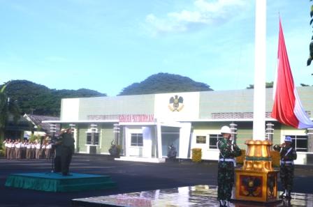 Bandar Lampung, (Penrem 043/Gatam) Kepala Seksi Teritorial Korem 043/Garuda Hitam Letnan Kolonel Inf Jan Piter Sipayung memimpin pelaksanaan upacara penaikan bendera Merah Putih di halaman apel Makorem 043/Garuda Hitam Kedaton Bandar Lampung.