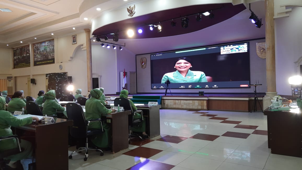 Para Istri Siswa Dikreg LIX Seskoad TA 2020 di wilayah Kodam II/Swj tersebut, menerima pelatihan kepemimpinan dari Ketua Umum Persit Kartika Chandra Kirana (KCK), Ny. Hetty Andika Perkasa secara Virtual atau Video Conference, pada Kamis (19/11/2020) bertempat di Gedung Sudirman Makodam II/Swj Jln. Jenderal Sudirman KM. 2,5 Palembang.