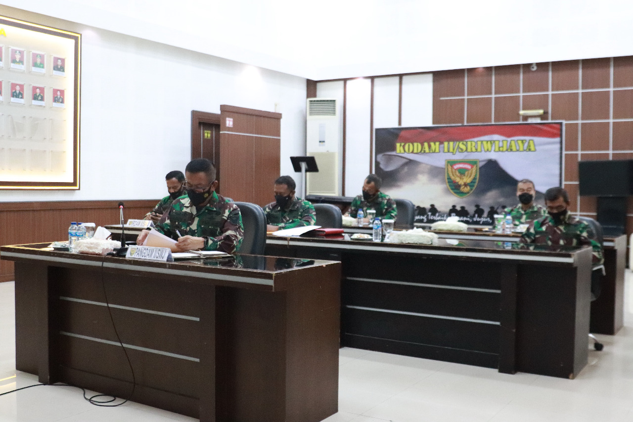 Pangdam II/Sriwijaya Mayjen TNI Mayjen TNI Agus Suhardi di dampingi Kasdam II/Swj Brigjen TNI Muhammad Zamroni beserta para Pejabat Utama Kodam II/Swj antara lain, Irdam II/Swj, Kapok Sahli Pangdam II/Swj, Asops Kasdam II/Swj, Aster Kasdam II/Swj dan Kakesdam II/Swj melaksanakan Video Conference (Vicon) dengan Panglima TNI Marsekal TNI Hadi Tjahjanto, Senin (21/6/2021) bertempat di Ruang Gatot Subroto Makodam II/Swj Jln. Jenderal Sudirman KM. 2,5 Palembang.