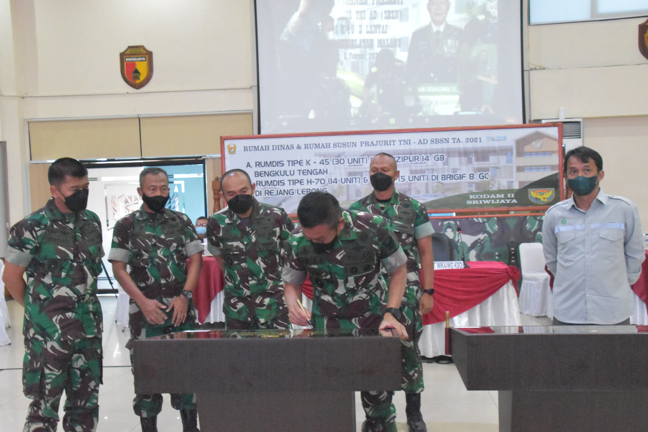 Pangdam II/Sriwijaya Mayjen TNI Agus Suhardi mengikuti Acara Peresmian Rumah Dinas (Rumdis) TNI AD biaya dari Surat Berharga Syariah Negara (SBSN) Tahun Anggaran 2021 yang dipimpin langsung oleh Kasad Jenderal TNI Dudung Abdurrahman, secara virtual dari POLTEKAD Kodiklatad, Malang, Kamis (3/2/2022).   Peresmian Rumah Dinas TNI AD yang merupakan salah satu proyek yang dibiayai dari SBSN ini ditandai dengan Pemotongan Pita dan Penandatanganan Prasasti, yang diawali oleh Kasad Jenderal TNI Dudung Abdurrahman. Selanjutnya diikuti Penanganan Prasasti Brigif 8/GC dan Denzipur 14/GB oleh Pangdam II/Swj Mayjen TNI Agus Suhardi, Kamis (3/2/2022) di Gedung Sudirman Makodam II/Swj Palembang.