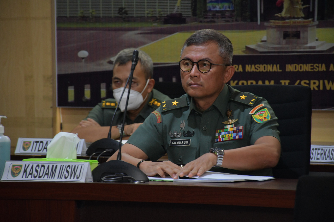 Rapat yang dilaksanakan secara virtual ini diikuti oleh Kasdam II/Swj Brigjen TNI Gumuruh Winardjatmiko, S.E., M.B.A., didampingi Kakudam II/Swj, Waaster Kasdam II/Swj dan Perwira Staf Itdam II/Swj bertempat di Ruang Puskodalops Kodam II/Swj Makodam II/Swj Palembang, Rabu (6/4/2022).