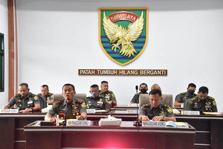 Palembang, (Pendam II/Sriwijaya). Bahas kesiapan Satuan jajarannya dalam rangka mengantisipasi perkembangan situasi (bangsit) menjelang Hari Raya Idul Fitri 1443 H/2022 M, Pangdam II/Mayjen TNI Agus Suhardi, memimpin rapat melalui Video Conference (Vicon) dengan seluruh Komandan Satuan (Dansat) jajarannya, Rabu (27/4/2022) bertempat di Ruang Audiensi Pangdam Gedung C Lantai - 4 Makodam II/Swj Jln. Jenderal Sudirman KM 2,5 Palembang.