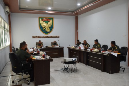 Palembang, (Pendam II/Sriwijaya). Panglima Kodam II/Sriwijaya Mayor Jenderal TNI Agus Suhardi menerima Paparan Rencana Garis Besar (RGB) terkait Apel Komandan Satuan (AKS) Tersebar Kodam II/Swj TA 2022 dari Asops Kasdam II/Swj Kolonel Inf Muhammad Mahbub Junaidi yang akan dilaksanakan di Markas Yonkav 5/DPC Kompleks Karang Endah.