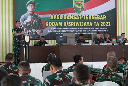 Kegiatan Apel Komandan Satuan (AKS) Tersebar yang telah digelar Kodam II/Swj diikuti 112 peserta yang terdiri dari para Danrem, para Dan/Kabalakdam II/Swj, para Dandim, para Dansatpur/Dansatbanpur, para Danden Satuan jajaran Kodam II/Swj dilaksanakan selama 3 hari, mulai 18 Mei s.d 20 Mei 2022 tersebut berlangsung dalam keadaan lancar, tertib dan aman. Dalam arahannya Pangdam II/Swj Mayjen TNI Agus Suhardi mengatakan, kesempatan berkumpul dan bersilaturahmi ini sangat langka, harus disyukuri dan dimanfaatkan. Para peserta harus pandai memanfaatkan kesempatan ini untuk membentuk komunikasi dengan rekan sejawat di lingkungan Kodam II/Swj, sehingga para peserta dapat memetik sebuah manfaat yang positif untuk dijadikan oleh-oleh/referensi untuk memimpin satuannya. Hal mendasar yang diingatkan Pangdam bahwa pertemuan seperti ini harus dipandang dari sudut positif guna membangun semangat, motivasi dan kreatifitas dalam kepemimpinan di satuan masing masing. "Jangan kalah semangat dengan para Atlet Dispable, mereka dengan segala keterbatasannya mampu menembus prestasi yang tidak kalah membanggakannya seperti para atlet yang memiliki organ tubuh lengkap", kata Pangdam. "Intinya, kita harus mau perang dengan diri kita sendiri, dan harus mampu mengatasi kemalasan dalam diri sendiri", tegasnya Bila diaplikasikan dengan kondisi satuan kita saat ini, kita masih memiliki banyak kelebihan fasilitas dan kondisi lebih yang sangat berpotensi untuk kita kembangkan menjadi prestasi, jangan sia-siakan. Tumbuhkan rasa kompetitif yang sehat di satuan, agar mampu memompa semangat anggota di satuan. Setiap anggota memiliki kelebihan dan kekurangan, hendaknya kita pekai dan jeli dalam mengembangkan kelebihan anggota dan mendorongnya untuk berprestasi. Jangan pernah menyerah dengan kondisi, itulah gunanya kita saling berkomunikasi untuk mendapatkan solusi terhadap kendala yang kita hadapi di wilayah. Ada sejuta jalan atau banyak jalan menuju Roma, bila kita memiliki kemauan yang kuat dan kokoh. Rubah Mindset kita dari pemikiran yang biasa biasa saja menjadi pemikiran dan tindakan yang luar biasa, tentunya hal hal yang positif. "Berbuatlah sesuatu di satuan mu, jangan menunggu disuruh untuk berbuat, karena itu pahami benar situasi dan kondisi satuan berikut wilayah pendukungnya, agar kita paham akan berbuat apa", pungkas Mayjen TNI Agus Suhardi. Pangdam juga mengingatkan agar menggunakan Metoda yang tepat untuk memimpin satuan, disesuaikan dengan karakter satuan. Jangan pernah melakukan pembiaran terhadap kesalahan dan kekurangan prajurit di satuan, agar kita tidak terlambat untuk mengambil langkah tindakan yang membangun. "Lakukan evaluasi kepada diri sendiri, anggota dan satuan, agar kita selalu mendapatkan koreksi perbaikan yang baik. Jangan pernah berhenti untuk berbuat yang terbaik untuk diri sendiri dan satuan, kalau hanya biasa biasa saja, ya... namanya kita merugi, ketinggalan dengan tuntutan jaman", jelasnya. Dalam kesempatan tersebut, Pangdam mengucapkan terima kasih kepada semua pihak atas kontribusinya, sehingga Apel Komandan Satuan Kodam II/Swj Tahun 2022 ini dapat berjalan dengan baik, tertib, aman dan lancar. "Semoga Allah SWT senantiasa memberikan kekuatan, bimbingan dan kemudahan kepada kita sekalian untuk melanjutkan tugas di satuan", ucap Pangdam. Turut hadir dalam upacara penutupan Apel Komandan Satuan tersebut, Kasdam II/Sriwijaya Brigjen TNI Gumuruh Winardjatmiko, S.E., M.B.A., Irdam II/Swj, Kapok Sahli Pangdam II/Swj, para Danrem, Danrindam, Para Asisten, Para Dan/Ka Balak Jajaran Kodam II/Sriwijaya, Para Dansat satuan jajaran Kodam II/Swj.