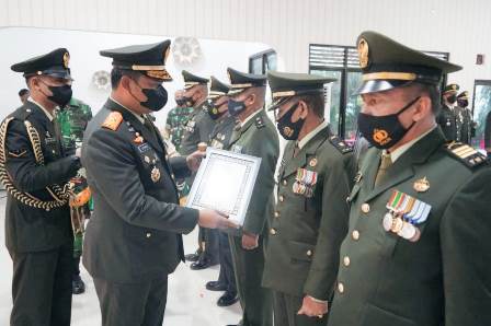 Pendam II/Sriwijaya Jambi - Komandan Korem 042/Gapu Brigjen TNI Supriono, S.IP., M.M memimpin Acara Purnawira Perwira Korem 042/Gapu TA. 2022 bertempat di aula rumah dinas Danrem Jl. Sultan Thaha Kel. Legok Kec. Danau Sipin Kota Jambi, Sabtu pagi (28/5/2022).
